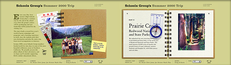 This web-based journal chronicled a backpacking trip for teens in an environmental program. The notebook, maps, and compass were composited using Photoshop and combined with the students' photos.